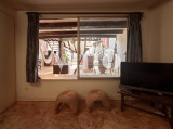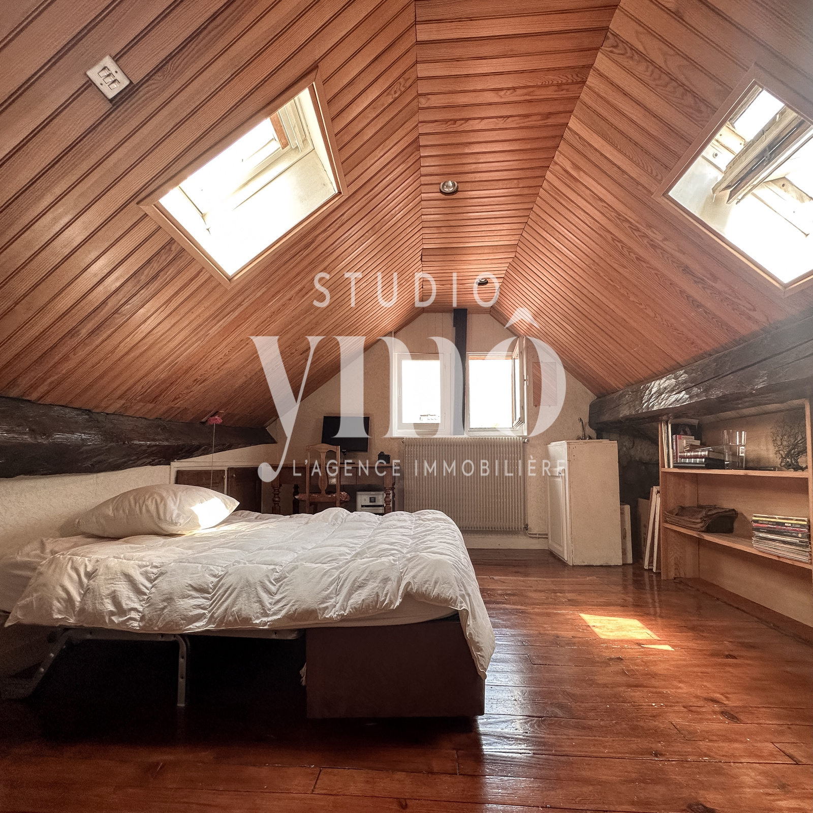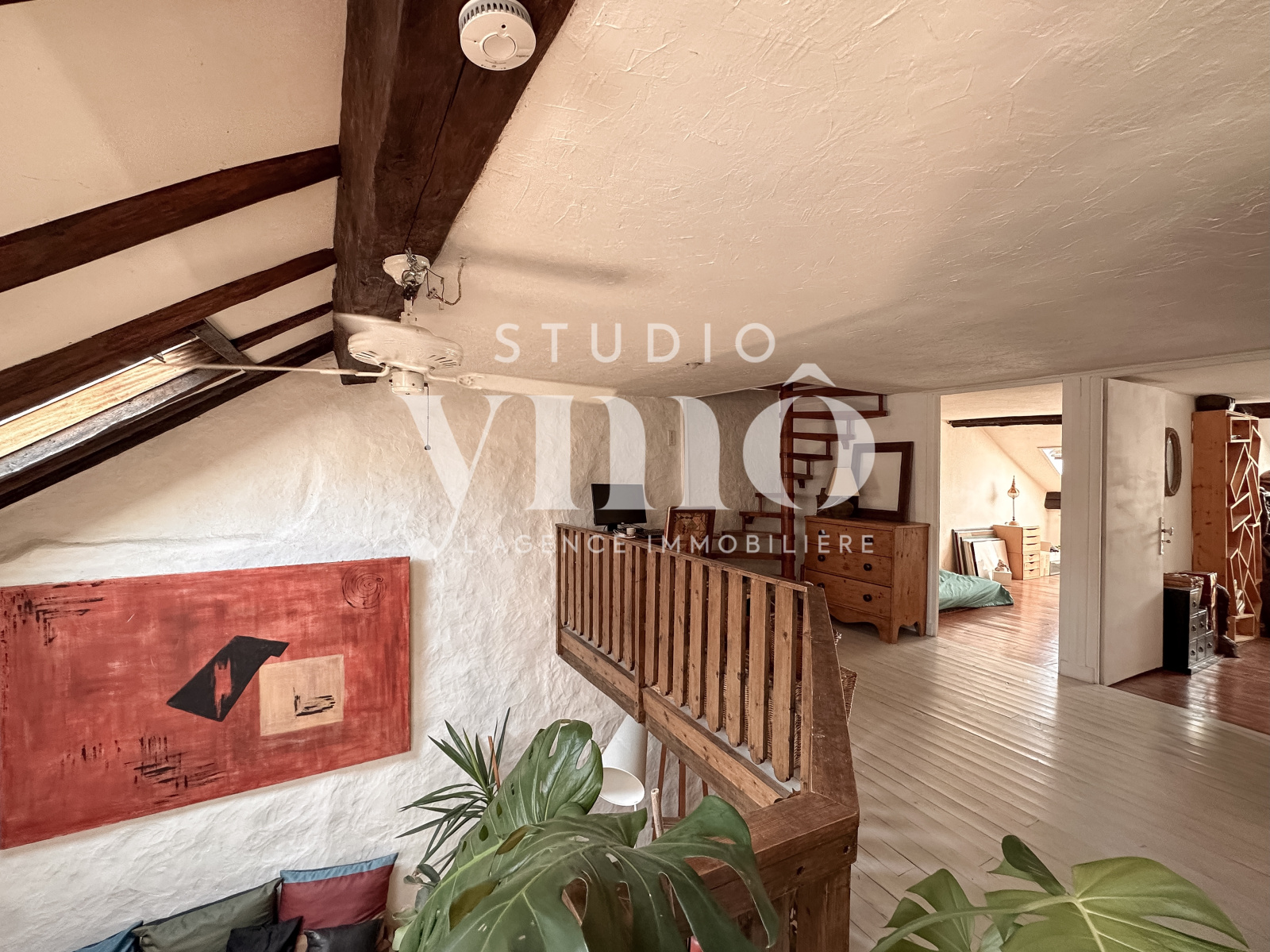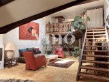 À l’étage supérieur, baigné de lumière grâce à une impressionnante hauteur sous plafond de 4 mètres, un second salon prolonge l’inspiration artistique du lieu. Deux chambres, une salle de bain, une salle d’eau avec WC complètent cet étage chaleureux et singulier.