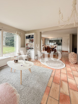 Dès l’entrée, laissez-vous séduire par les grandes ouvertures qui inondent chaque pièce de lumière naturelle. Le salon d’hiver, spacieux et convivial, invite à la détente tout au long de l’année grâce à son ambiance chaleureuse, ses vues imprenables sur le jardin et sa cheminée en pierre.